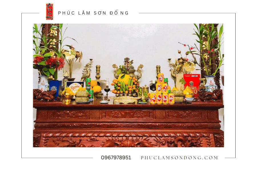 - Bàn thờ có thể được trang trí thêm với các đồ vật như hoành phi, câu đối để tạo thêm sự trang trọng và tôn nghiêm.