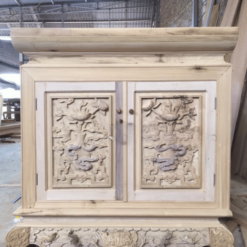 - Họa tiết chạm: Chạm các hoạ tiết Tam đa, Tứ quý, Quy Hạc, Sen Chiện, chữ Phúc, chữ Thọ trên cánh tủ thờ