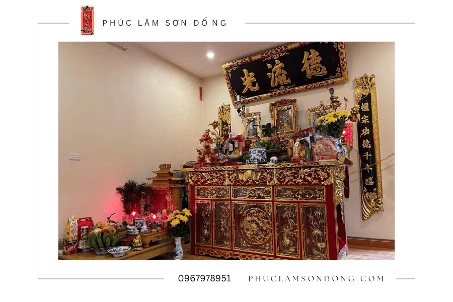 Gía gương và các vật dụng thờ cúng khác trong không gian thờ