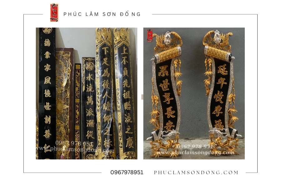 Câu đối là một thể loại văn học đặc biệt của Việt Nam, bao gồm hai vế câu đối được sắp xếp đối diện nhau để biểu thị ý nghĩa ngang nhau và hợp nhau, tạo thành một đôi hoàn chỉnh. Đôi câu đối thờ thường được chế tác từ gỗ và được trang trí bằng các loại sơn như sơn ta, sơn vecni, hoặc sơn son thếp vàng thếp bạc, tùy thuộc vào sở thích của gia chủ.