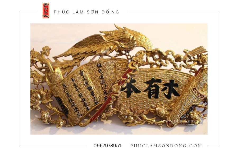 Lớp sơn thếp vàng không chỉ làm nổi bật những đường nét chạm khắc mà còn tạo điểm nhấn cho các chữ vàng, thêm vào đó là những yếu tố văn hóa và tâm linh. Sự kết hợp giữa sự tài năng của nghệ nhân và vẻ đẹp của vật liệu làm cho Cuốn Thư Chạm Tùng Hạc – Rồng Hóa Tùng trở thành một tác phẩm nghệ thuật không chỉ làm đẹp cho không gian tâm linh mà còn là nguồn cảm hứng và sự hâm mộ từ những người yêu nghệ thuật và truyền thống văn hóa.