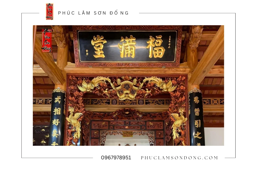 - Sự Trang Trọng Với Màu Sắc: Hoành phi thường được sơn son thếp vàng hoặc sơn đen với chữ màu vàng hoặc đỏ. Sự kết hợp của màu vàng và đỏ thể hiện sự trang trọng và quan trọng của hoành phi trong không gian thờ cúng. Các bức hoành phi này thường được trang trí với các hoạ tiết và họa tiết tinh tế, tạo nên vẻ đẹp mắt và thu hút.