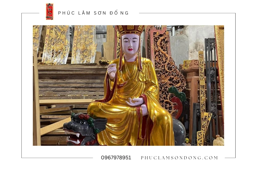 - Tư thế: Bồ Tát ngồi kiết gia trên một đài sen, thể hiện sự thiêng liêng và sự kết nối với tự nhiên. Tư thế ngồi này thường là tư thế vững chãi và thong thả, thể hiện sự an lạc và tự tại.
